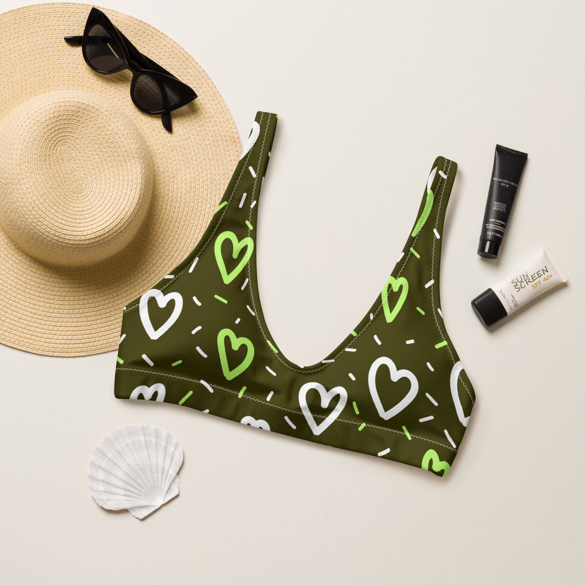 Get this all-over recycled bikini top for your summer adventures! It’s very comfortable and includes removable pads. To make it even more versatile, mix and match it with different bikini bottoms for a stylish look.